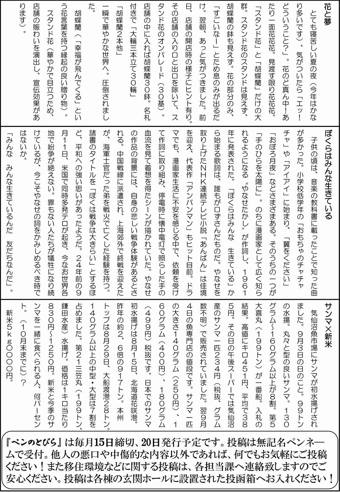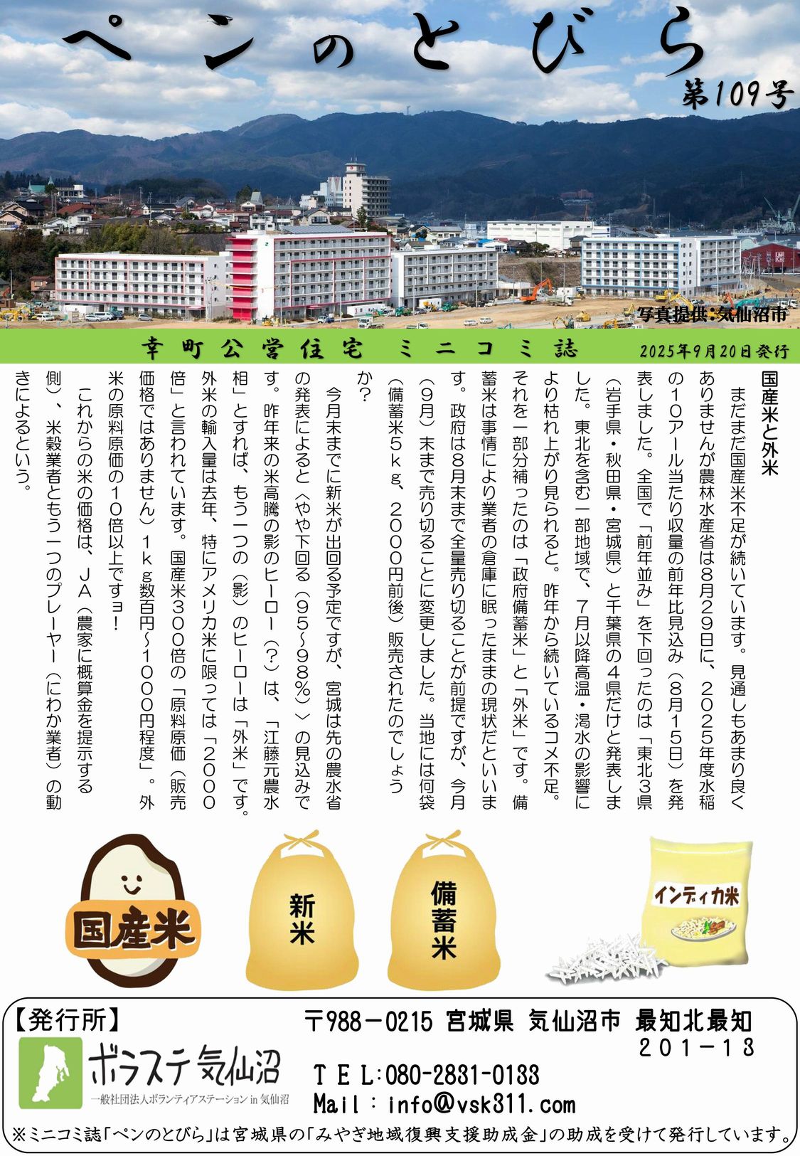 【市営幸町住宅】ミニコミ誌『ペンのとびら第109号』を発行致しました♪ 2025年9月22日ペンのとびらみやぎ地域復興支援助成金, ペンのとびら, ミニコミ誌, 市営幸町住宅畠山輔 毎月20日に「市営幸町住宅」の皆さま向けに発行している『ペンのとびら』第109号を、9月21日に発行いたしました。 今回も多くの皆さまからご投稿をいただき、心より感謝申し上げます。 ※『ペンのとびら』は、宮城県「みやぎ地域復興支援助成金」の助成を受けて発行しています。