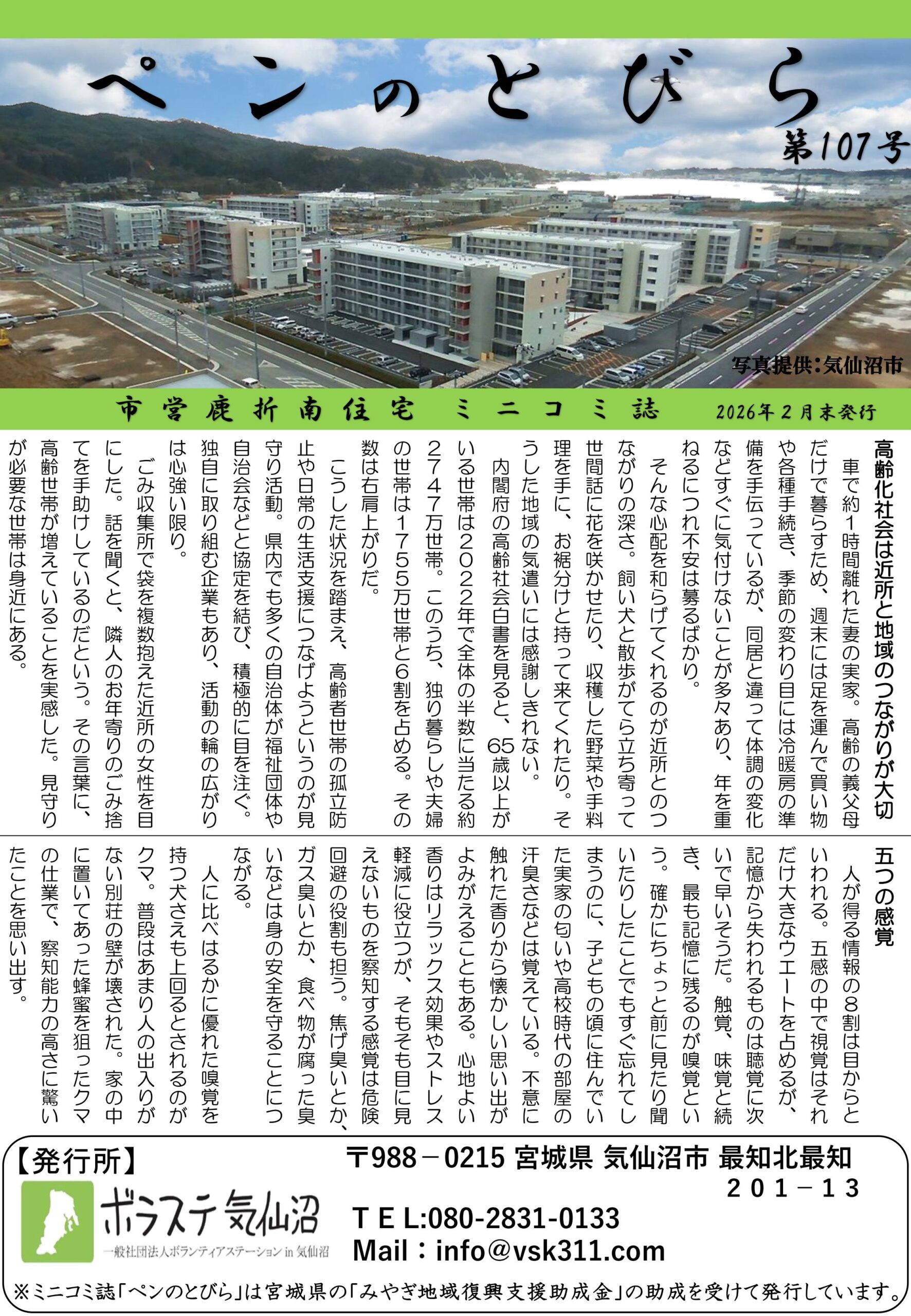 【市営鹿折南住宅】ミニコミ誌『ペンのとびら第107号 』を発行致しました♪ 2026年3月23日ペンのとびらみやぎ地域復興支援助成金, ペンのとびら, ミニコミ誌, 市営鹿折南住宅畠山輔 毎月月末に「市営鹿折南住宅」の皆さま向けにお届けしている 『ペンのとびら』ですが、2月末に第107号 を発行いたしました!📖 今回も、たくさんの投稿をお寄せいただき、本当にありがとうございます。 皆さまの声が紙面を彩っています。 次回の締切は 3月20日、発行は 3月末 の予定です。「ちょっとしたことでも伝えたい!」という気持ちを、 ぜひ次号に届けてくださいね。✏️ ※『ペンのとびら』は、 宮城県の「みやぎ地域復興支援助成金」の助成を受けて発行しています。